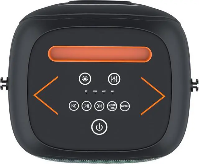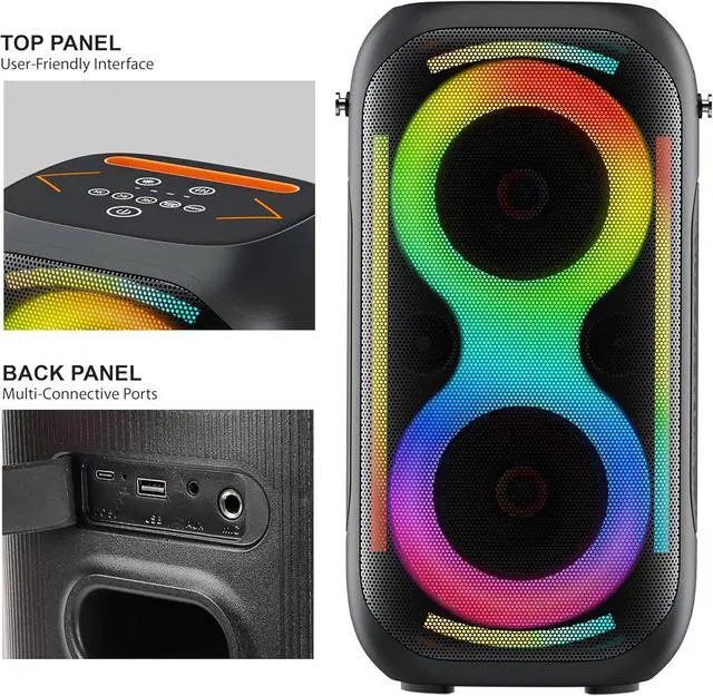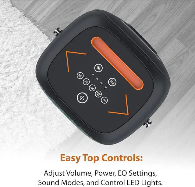 , - & -: Designed for convenience, this speaker features a sturdy carry handle for easy transport. The top control panel allows quick access to settings, making it the perfect companion for indoor & outdoor adventures