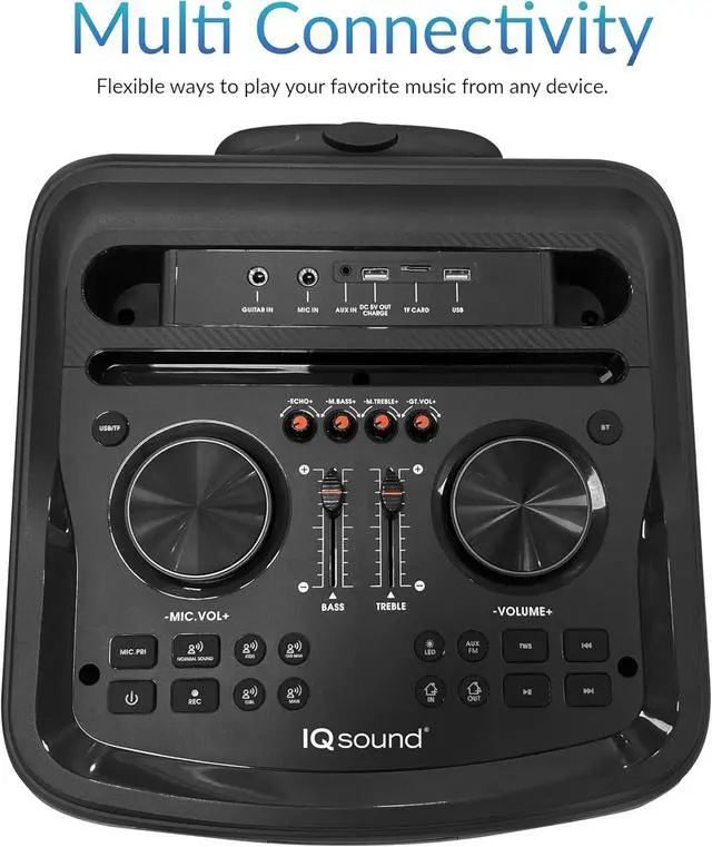 & : Enjoy multiple connectivity options: Bluetooth 5.0, Micro SD, USB, AUX, Mic Input, and Guitar Input. Tune into FM radio for nonstop music, news, or sports. Built-in media player enhances your listening experience.