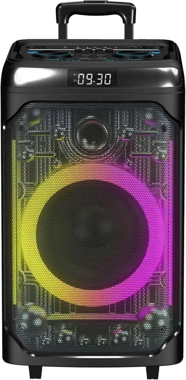& : Take your music anywhere with a sturdy trolley handle and built-in wheels for effortless transport. Power up via AC 100-240V input and enjoy a frequency response of 56Hz-17KHz for dynamic sound.