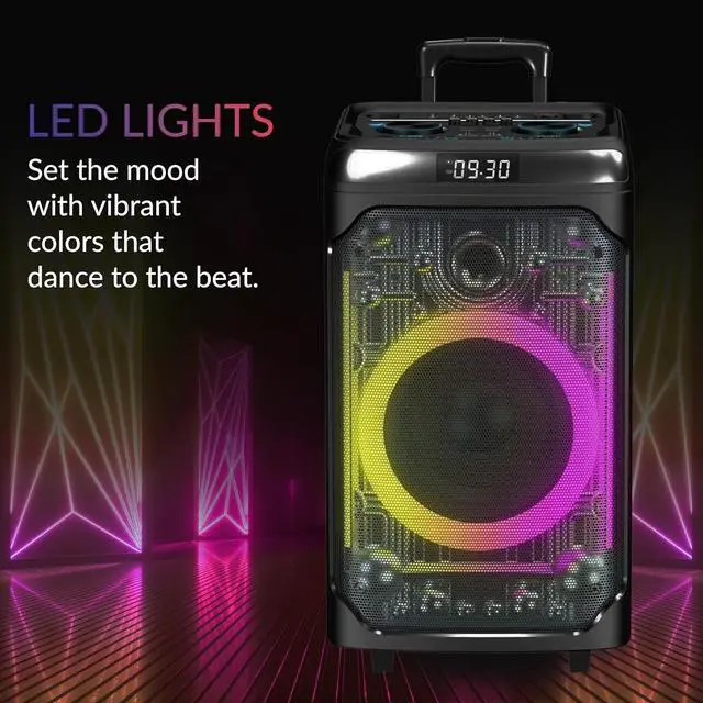 & : Colorful LED lights dance to the beat of your music, creating a lively atmosphere. True Wireless Stereo (TWS) lets you connect two speakers for double the audio output and stereo effect.
