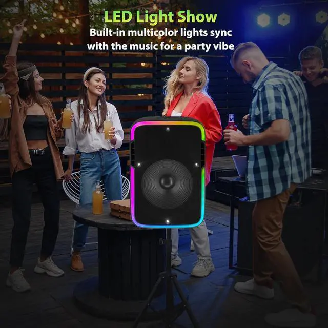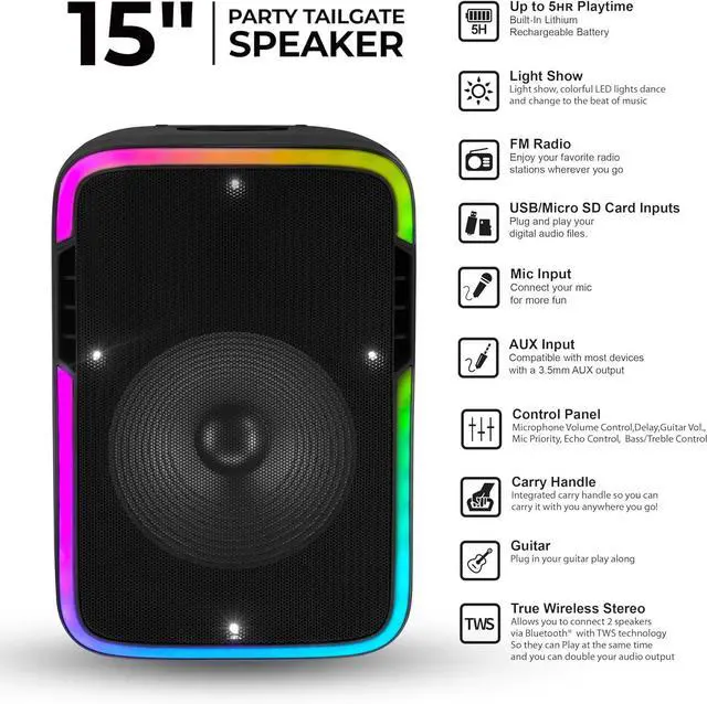 : Take the party anywhere with this 15" big bluetooth speaker featuring True Wireless Stereo. Connect two speakers bluetooth wireless and double the sound! LED lights sync with the beat for a full party box speaker vibe.