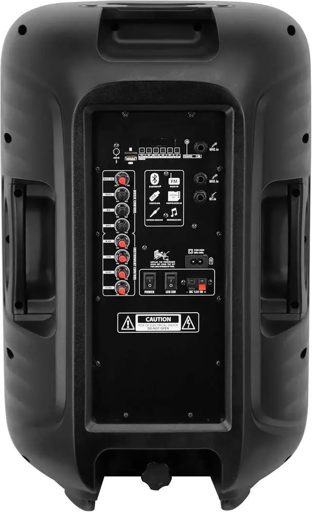 , : With 80W max power and a 15 inchwoofer + piezo tweeter, this monster speaker delivers deep bass and crystal highs. Built-in bluetooth speaker lets you stream from any device with Micro SD, USB, AUX, or FM support.