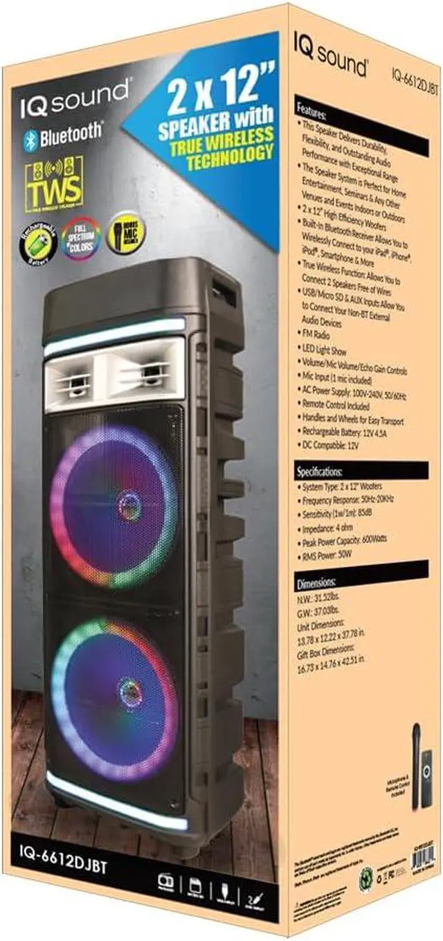 : This speaker offers outstanding audio quality with a wide frequency response of 50Hz-20KHz and a peak power capacity of 600 Watts, ensuring rich and powerful sound for any occasion.