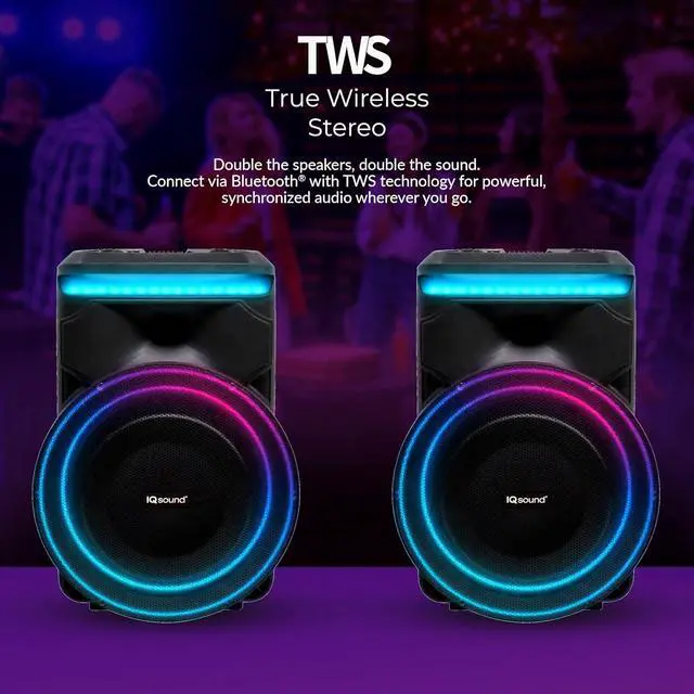 : Take your music anywhere with this 18 inch Portable Bluetooth Speaker! Whether for home entertainment, seminars, or outdoor events, enjoy powerful sound and deep bass. Built-in True Wireless Stereo (TWS) lets you pair two speakers for double the audio output!