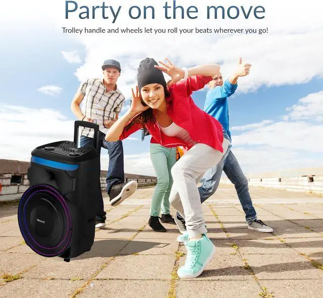 & : Designed for easy transport with a retractable handle and wheels, this speaker is perfect for any event! Enjoy Bluetooth, FM radio, USB, Micro SD, AUX, and Mic/Guitar inputs with support for up to 256GB storage for endless entertainment!