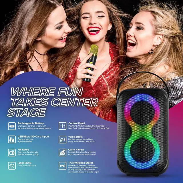 , & : This speaker includes a wireless microphone for karaoke, announcements, or events. Customize your sound with voice effects and an intuitive control panel - perfect for any gathering, performance, or party!