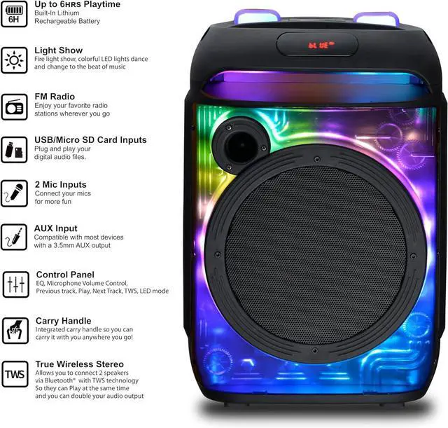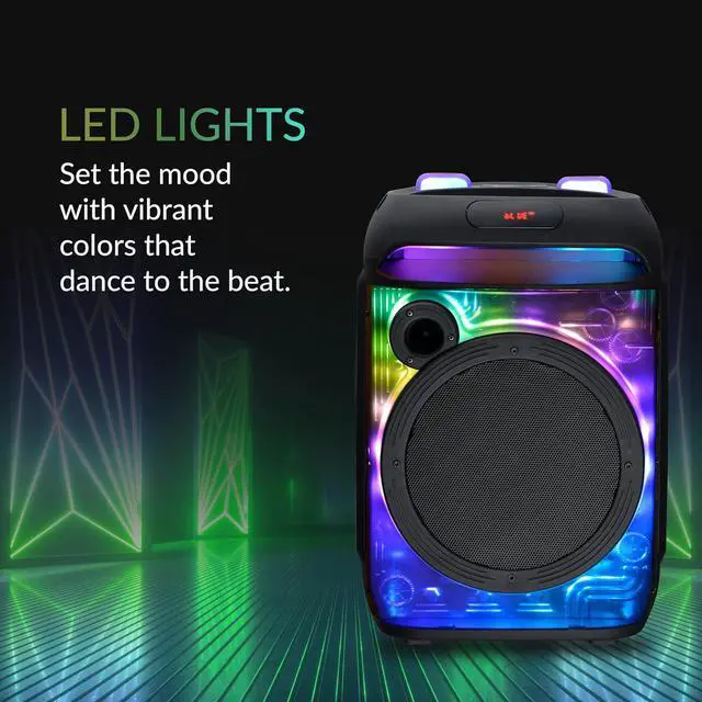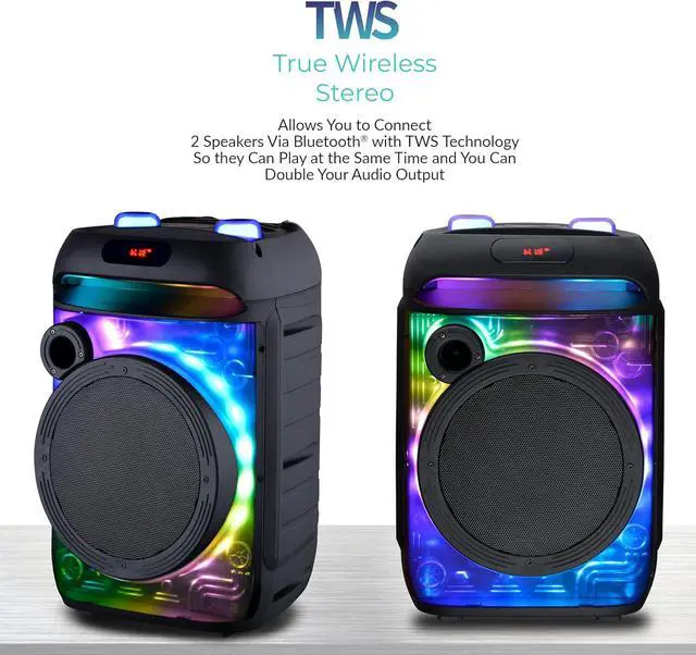 !: The speaker system is ideal for nightclubs, home entertainment, seminars, and events. Enjoy immersive sound anywhere with TWS, allowing two speakers to sync via Bluetooth 5.3 for double the audio output. Includes LED lights for added flair!