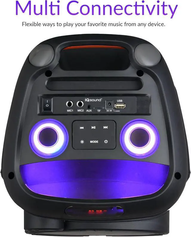 & : Includes a pole-socket for tripod mounting (tripod not included) and a rechargeable battery for easy mobility. Charging takes 5-6 hours, ensuring hours of uninterrupted music. Compact yet powerful, it's the ultimate portable sound solution!