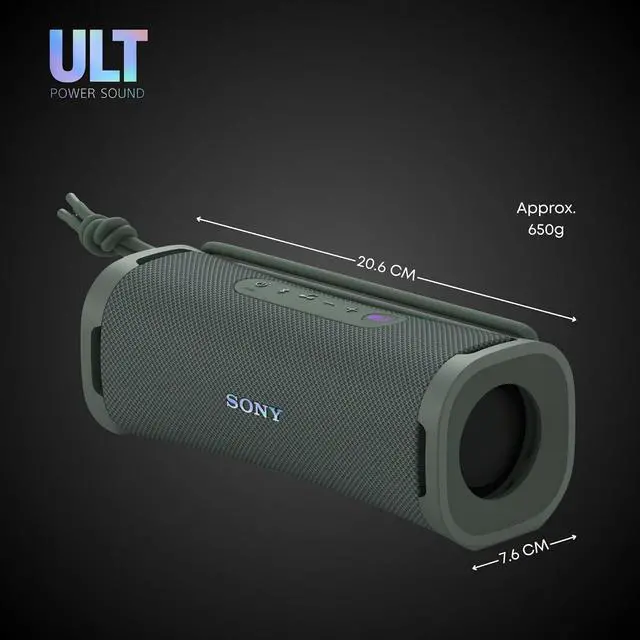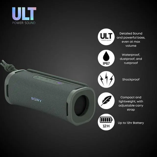 With the Sony ULT FIELD 1 Bluetooth Wireless Portable Speaker, experience enhanced bass and powerful sound built into a compact package. Complete with a multi-way strap for ease of use, take your waterproof, dustproof, and even shockproof speaker anywhere for longer, thanks to a long battery life. Dive into the front row of a concert with the ULT POWER SOUND series. Built for music lovers, it produces powerful deep sound designed to make your heart tremble. Prepare to feel the bass. Enhance your low-end frequencies for exceptional bass that will make your heart tremble. Enjoy booming bass and powerful sound in a compact package. Press the ULT button to enjoy the powerful sound and enhanced bass. The layout of the side passive radiators has been optimized to enhance bass sound. The Sound Diffusion Processor expands sound in any space with its DSP technology. An easy-to-carry design thats waterproof, dustproof, and shockproof. This compact speaker is designed to let you take your music anywhere thanks to its multi-way strap and the long battery life keeps the party going longer when you get there. With its compact, easy-to-grab design, you can take it with you wherever you go. Use the detachable multi-way strap to carry the speaker with you, or suspend it outdoors. With an IP67 water and dustproof rating, this speaker is ready for just about anything. It's also rustproof, which means you can enjoy music even at the beach. The ULT FIELD 1 has undergone extensive shock testing to ensure it can withstand the inevitable knocks, bumps, and scrapes that come with everyday use. Up to 12 hours of battery life, pumping out music as long as you like.