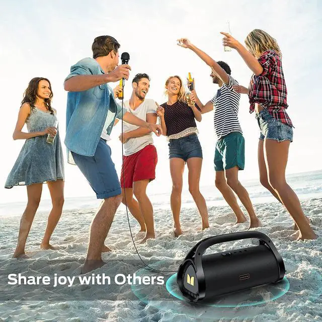 1For Karaoke2For Gathering3For Surfing4For Party1100W Monster Sound2Multiple Playback Modes3Easy to Control1Portable Speaker2Beach Speaker3Handle Design For better enjoyment, you should fully charge the speaker before use. The package includes a USB-C charging cable (change only,no data transfer function) that can be connected to your computer or other device made for standard USB compatible charging. Charging with 5V/2A or above power adapter (not included). Caution: ONLY use computer USB output or standard 5 volt only power adapter for charging.Damage may occur if non-standard USB power adapter is used for charging. Do not charge if connector and/or device is wet or damaged.