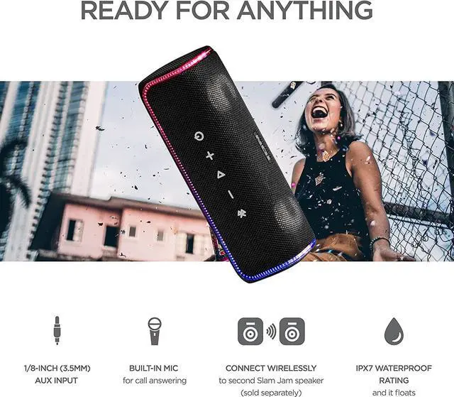 This IPX7 Waterproof Outdoor Bluetooth Speaker with Aux Input is Ready for Anything - 1/8-inch (3.5mm) Aux input; built-in mic; Connect wirelessly to second Slam Jam speaker (sold separately)