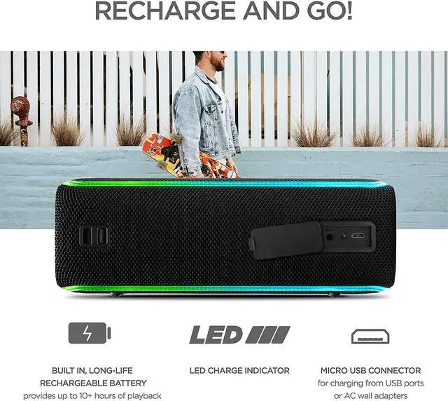 Bluetooth Wireless Speaker with Rechargeable Battery Rechargeable battery provides 10 plus hours of playback; LED charge indicator; Micro USB connector for charging via USB ports and AC wall adapters