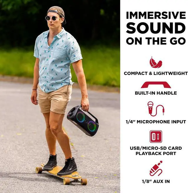 Wireless Connectivity - Stream and control music up to 100ft via Bluetooth 5.0; plug in a USB drive/SD card for music playback; grab the convenient top handle and take your tunes anywhere you like