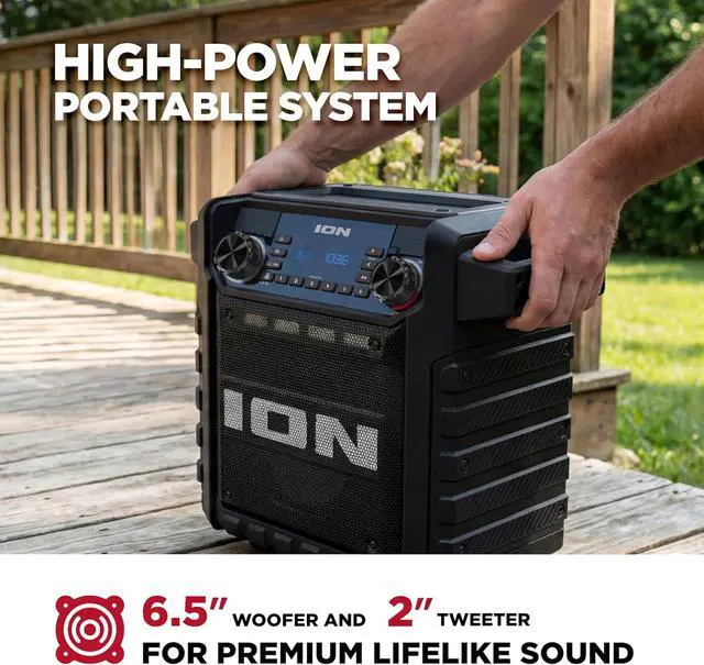ION Tailgater Classic Outdoor Portable Bluetooth Speaker with Rechargeable Battery, FM Radio, USB Port, IPX5 Water-Resistant, 6.5" Woofer, App, Black