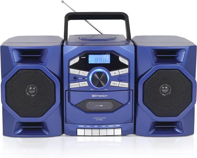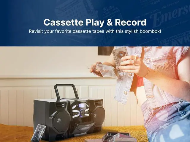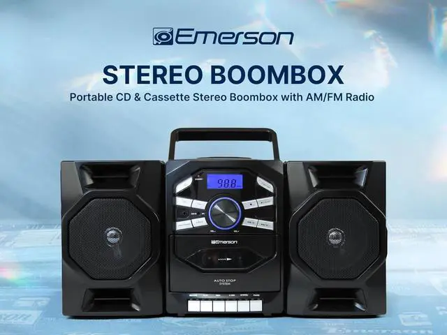 ALL-IN-ONE PORTABLE CD/CASSETTE PLAYER BOOMBOX: Discover the Emerson Portable CD/Cassette Player Boombox, featuring a top-loading CD player, cassette player, tape recorder, and AM/FM radio. Ideal for home, travel, outdoor & indoor use with a convenient carrying handle for easy portability.