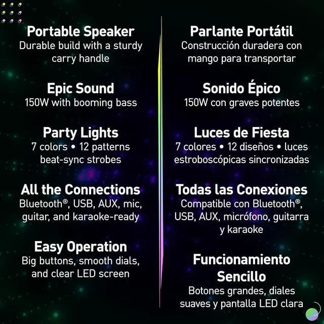 Take the party anywhere with the BMAX 5 portable speaker! Whether you're at the beach, park, or hanging out at home, its built-in rechargeable battery, powerful sound, and vibrant light show will keep the good vibes going. With an easy-to-use design that interfaces with both wired and wireless inputs, it's ready for any adventure. Packed with 14cm woofer and double tweeters, bass reflex ports, and 75W of audio power, this speaker delivers rich, room-filling sound. From deep bass to crisp highs, every beat and note comes through loud and clear. Add in multicolor lighting and Bass Boost, and you've got a party-perfect speaker thats as fun as it is powerful. Stream your favorite songs via Bluetooth®, plug in your guitar or mic for live jams, or turn it into a karaoke machine with friends. You can even connect multiple speakers for an epic sound experience. With USB playback, AUX input, and Chain Connection, this speaker is ready for whatever youve got planned, all in a compact package. Dance the night away with up to 9 hours of playtime on a single charge. A built-in display shows battery life, while the sturdy handle and tough design make it easy to grab and go. No matter where you are, the music keeps going strong. For extra flair, sync the lights to your music with 7 colors, 12 patterns, and two strobe lights to choose from. The intuitive controls, big buttons, and an LED screen make it super easy to useno fiddly switches here! Just plug in, turn up, and let the party begin.