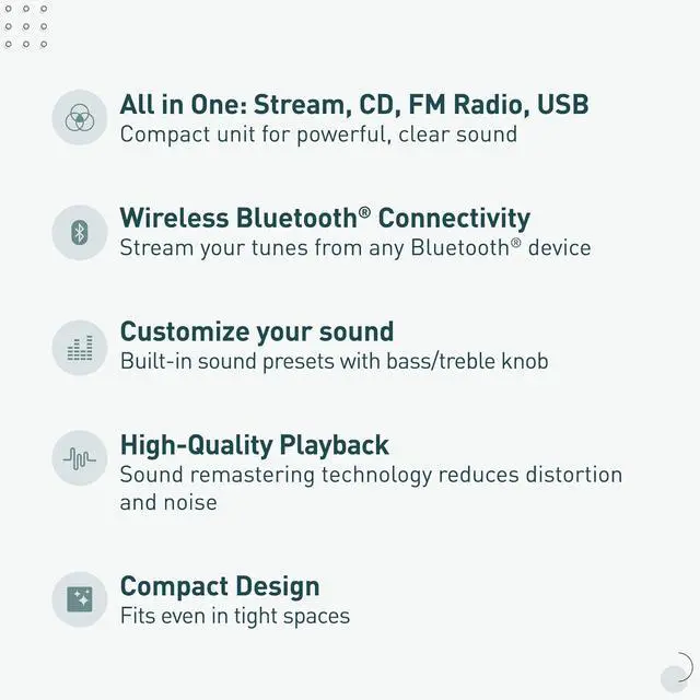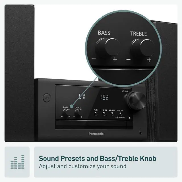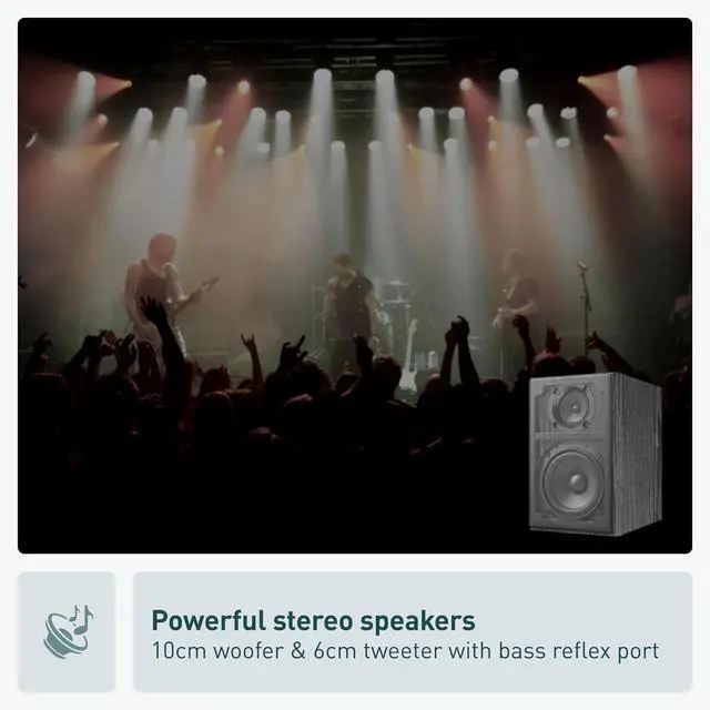 80W(40W+40W) RMS output for Powerful, Clear Sound in a Compact Package: CD player, radio, and wireless Bluetooth playback all in one, together with stereo speakers; with 10cm Woofer & 6cm Tweeter with Bass Reflex Port