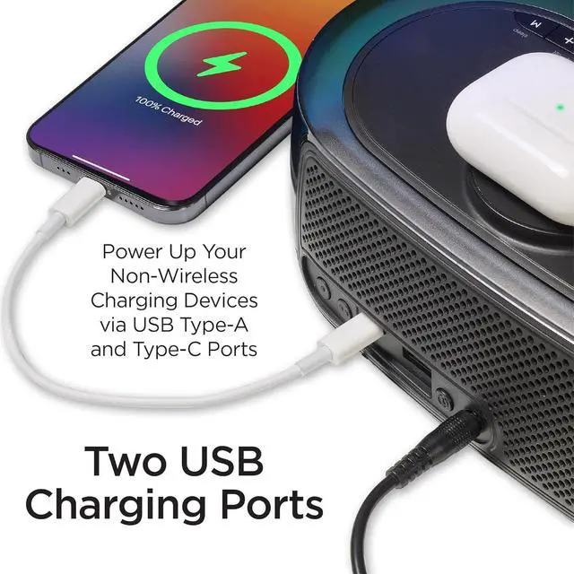 2 USB Chargers: Charge your devices via USB Type-A and Type-C ports located on the back of the unit (cables not included). Built-in battery backup saves clock settings (2 AAA batteries required, not included).