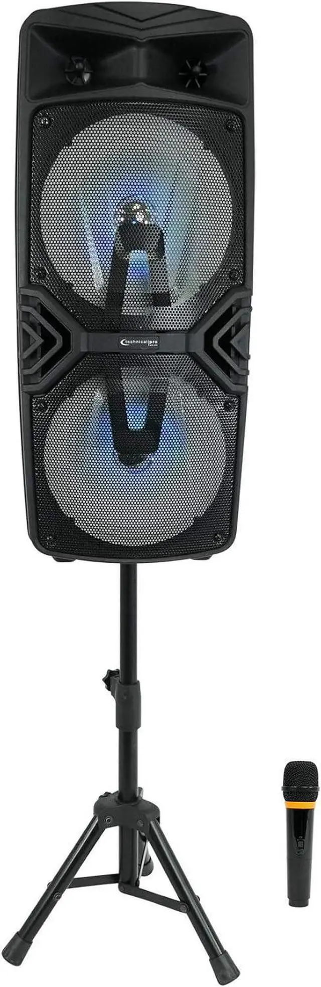 Sensitivity: 95 2dB (1W@1M). LED Party lights. Carry Handle. Tripod Included. Specifications: Product Weight: 8.5 lbs.