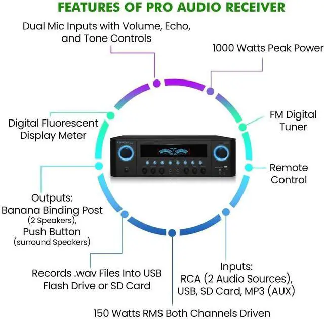 1000 WATTS PEAK POWER: The stereo Receiver for home theater system gives you 1000 watts max power w/ 120W RMS for a high quality amplified audio. Perfect for karaoke & home theater acoustic surround sound system