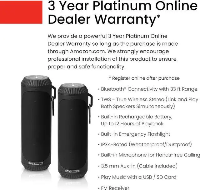 BOSS Audio Systems provides a powerful 3-year platinum online dealer so long as the purchase is made through . We strongly encourage professional installation of this product to ensure proper and safe functionality