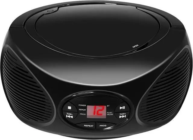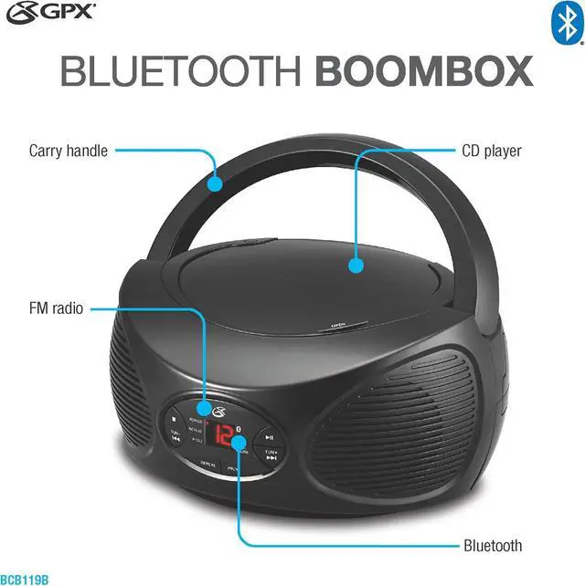 The minimalistic design makes this device easy for all ages to use and enjoy. The GPX Portable FM Radio Boombox and CD Player lets you take your music with you in style. Stream music from your device to this boombox for unrivaled control of your listening experience. This portable boombox features top load CD player and AM/FM radio. Features include powerful built-in stereo speakers, programmable tracks, analog volume control and built-in FM/AM antenna. Black. AC power adapter included. DC battery power: requires 6 C batteries (not included).