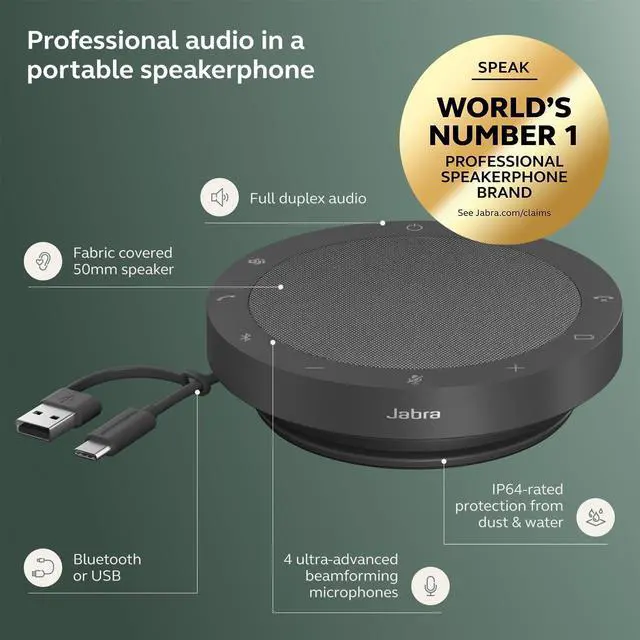 Our pocket-sized Jabra Speak2 55 Portable Speakerphone is designed for hybrid working. 50mm full-range speakers with wideband audio deliver powerful sound wherever you work best. Four ultra-modern beamforming microphones pick up sounds from all directions, whilst the noise-cancelling technology filters out background noises for crystal-clear conversations. Full duplex technology preserves the natural flow of face-to-face conversations, making this the perfect speakerphone for conference calls. Speak2 55 wireless Bluetooth speaker has the latest state-of-the-art Voice Level Normalization technology, which automatically equalizes voices to the same volume level so that everyone can be heard and speak naturally. Connect the Jabra speaker to your computer via the USB-C cable (with USB-A adapter) or connect the wireless speaker to your phone via Bluetooth 5.1. With a wireless range of up to 30m and 12 hours of battery life, you can operate freely while collaborating seamlessly. The speaker is also certified to work with Microsoft Teams. Additionally, Speak2 55 is water and dust resistant and comes with a 2-year warranty.