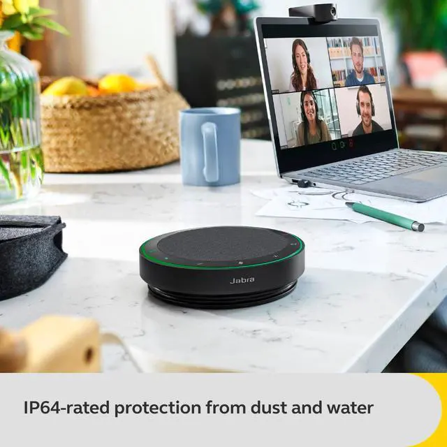 Speak2 75 is the only conference speakerphone with a custom-designed Microphone Quality Indicator (activated via the Jabra Sound+ or Jabra Direct apps) that shows you how well your voice is being picked up. In addition, its cutting-edge Voice Level Normalisation technology ensures that everyone is heard when they speak. With a battery life of up to 32 hours, you can operate wirelessly within a range of up to 30m and for seamless collaboration, the wireless speaker is fully compatible with Unified Communications platforms such as Zoom or Google Meet. Speak2 75 is water and dust resistant and comes with a 2-year warranty.