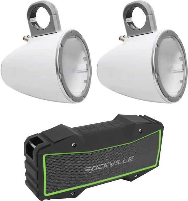 Completely Waterproof with IPX6 Rating - You can submerge it under water for 20 seconds without damaging it. Built in TF card slot with support for up to 256gB TF card. TF card supported file formats: MP3/WMA/APE/FLAC/WAV. Fast Charge Time: 3 Hours. 3600 mAH Polymer battery supports up to 47-hour playback at 25% volume, 27 hours of playback at 50% volume, and 5 hours of Playback at max volume. ROCK EVERYWHERE is bar mountable and include the mounting clamp that screws into the bottom of the speaker. Battery charges with included USB cable. 3 LED battery life indicators. Distortion: Less than 1%. Frequency Response: 80 Hz -20 kHz. Play, Pause, Skip Forward, Skip Back, Volume Up, Volume Down. Will control next song, pause, play on popular apps like Pandora, Spotify, and others. 40 Foot Maximum Bluetooth Range. The built-in microphone allows you to make and receive phone calls hands-free. Compatible with any Bluetooth devices such as iPad, iPhone, Laptops, Android phone, other cell phones, ipods, other Bluetooth MP3 Players. iPhone and Android devices will display the battery life of the speaker when connected through Bluetooth. Rugged and Shockproof with Rubberized Impact-Resistant Silicone Feet. Perfect for shower, bedroom, kitchen, biking, restaurant, yoga, camping, hiking, pool, beach, on-the-go, and much more!. Product Dimensions: 7.2" x 3.23" x 2.32". Product Weight: 0.97 lbs. Color: Black body with silver end caps Bold With its bold cosmetics, the white KM enclosures with contrasting accent details complement KICKER's 6.5-inch coaxial marine speakers. The Rockville ROCK EVERYWHERE is a true wireless stereo (TWS) Bluetooth speaker that you will want to bring with you everywhere you go because it sounds so good!