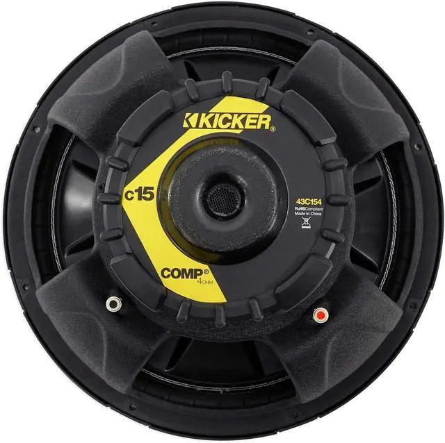 Features of 43C154: Kicker 43C154 Comp 15" 500 Watt SVC 4-Ohm Car Audio Subwoofer Sub, Size: 15 inches (38.0 cm), Impedance: 4 ohms SVC, Max Rec Amplifier Power: 500 Watts Peak, 250 Watts RMS, Recommended power range: 200 - 300 RMS, Thick Polypropylene Woofer Cone, High density UV treated surround, 360-degree back bracing,