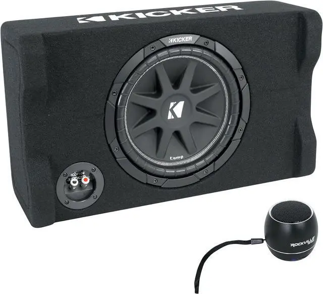 Package Includes: (1) Kicker 48CDF104 Comp10 10" 300w Down Firing Car Subwoofer in Sub Box Enclosure. (1) Rockville RPB2-BLACK Handheld Wireless Portable Bluetooth Speaker Great Sound