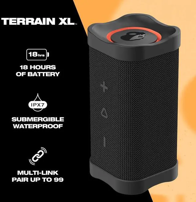 Take your music on any adventure with this bundle containing the Skullcandy Terrain XL and Mini portable Bluetooth speakers. Both feature an IPX7 waterproof rating to withstand immersion in 3 feet of water for 30 minutes, making them perfect for the pool, beach, or camping. Dual custom passive radiators in each produce a powerful, bass-rich audio experience that can fill any room. These speakers share the ability to wirelessly connect up to 99 Skullcandy speakers with Multi-Link technology for a huge party. The Terrain XL rocks an impressive 18 hours of battery life, while the Mini offers 14 hours, so you can keep the music pumping day and night. Each includes a nylon wrist wrap for easy portability and durability. With the ability to connect two devices at once and switch between them with one click, you'll never miss a beat. The Terrain XL stands out with its slightly larger size and louder maximum volume capable of covering huge crowds, while the Mini's compact size makes it ultra-portable. Together they form the ultimate bundle for music lovers and outdoor adventurers who need to take high-quality, booming sound anywhere their exploits may take them.