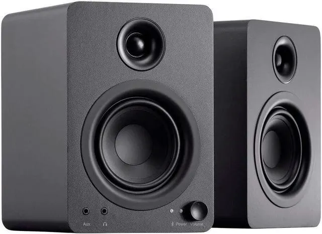 Premium drivers and build. High-performance drivers. Compact, ported cabinet.Clear, full audio is delivered by high-output 4" Polypropylene woofers and 0.75" Silk dome tweeters that are powered by a 60-watt class AB amplifier. The rounded and ported MDF cabinet has been custom tuned for superior near-field frequency response and sonic performance, while ensuring that they look as good as they sound.