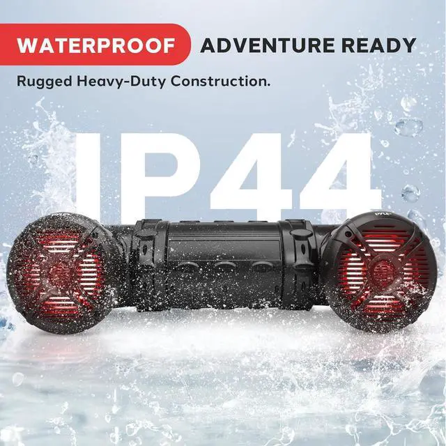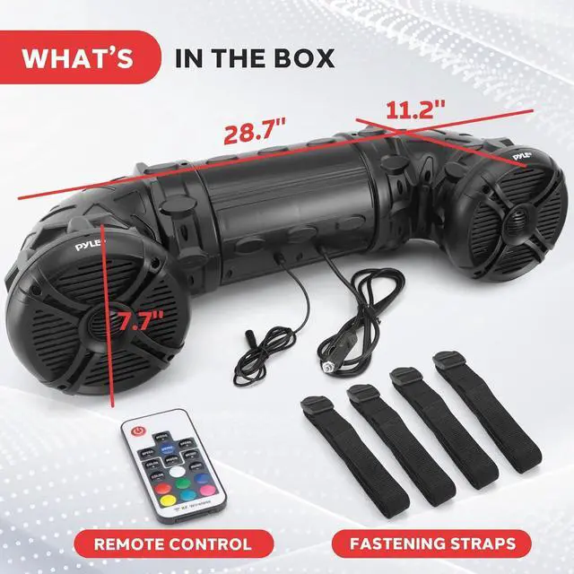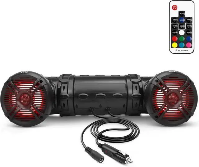 Clear the path with off-road Pyle power! This rugged & waterproof speaker system is ideal for ATVs, UTVs and just about any other vehicle taking the road less traveled! Steer your way to full range stereo sound and distortion-free audio processing technology -- along with built-in color changing lights that add style! You will be able to enjoy booming, high-powered wireless music streaming wherever you ride. Bluetooth connectivity allows you to stream audio from all of your favorite devices hands-free. Heavy-duty marine grade weather-resistant housing adds some attitude, when you blaze the trails with this custom-styled speaker cabinet. The system can be powered via simple plug and play connection with the included cigarette lighter power outlet accessory cable, or you can choose to hard-wire for permanent mounting. Pyles Off-Road Bluetooth Speaker System helps you kick up some dust with rugged sound power! System Features:Universal Vehicle Mounting Ability