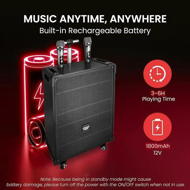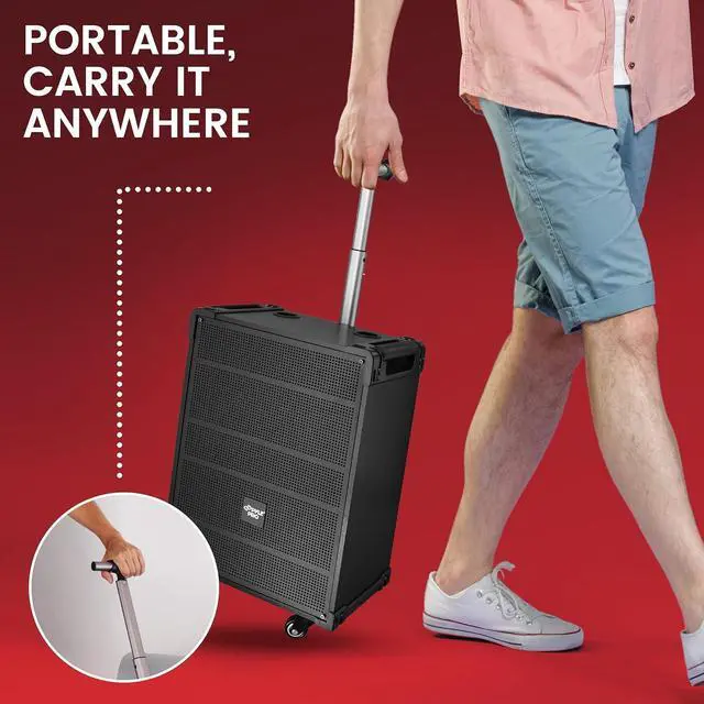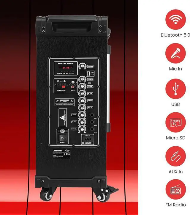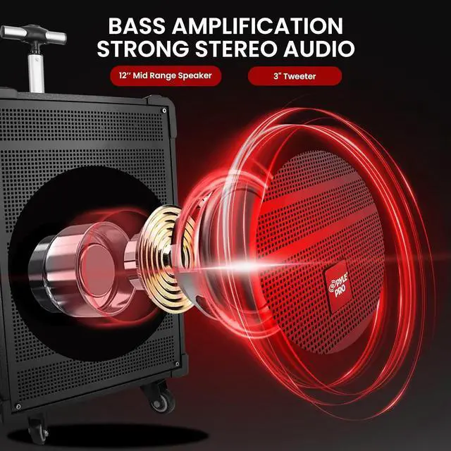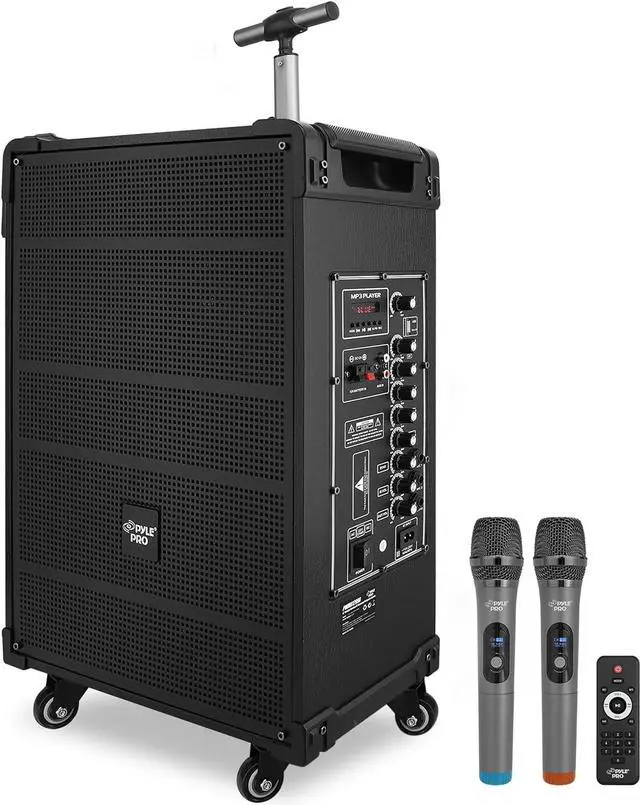 Features: - Compact, Portable & Powerful PA Speaker System - Karaoke Microphone Talk-Over Mode - Bluetooth Wireless Audio Streaming - Built-in Rechargeable Battery - FM Radio with Digital LED Display - USB Flash & Micro SD Memory Card Readers - MP3 Digital Audio File Compatibility - Audio Recording Function - 1/4 Microphone Input - Aux (3.5mm) Input Jack - Connect & Stream Audio From External Devices - Full Range Stereo Sound Reproduction - Impressive Bass Response - Echo, Bass, Volume Adjustment - Convenient Carry Handle & Rolling Wheels - *Optionally Powered via External Device, 12V Connectors - Rugged & Heavy-Duty Design Bluetooth Connectivity: - Built-in Bluetooth for Wireless Streaming - Works with All of Your Favorite Devices - (Smartphone, Tablet, Laptop, Computer, etc.) - Bluetooth Wireless Range: 33'+ Ft. - Bluetooth Version: 5.0 Whats in the Box: - Portable PA Speaker - (2) Wireless Handheld Microphone - Power Cable - Remote Control Technical Specs: - MAX Power Output: 800 Watt - Sound System: 12 Mid-Range Speaker + 3 Tweeter - Impedance: 4 Ohm - S/N Ratio: 60dB - Built-in Rechargeable Battery: 12V/7AH - Power Supply: 120/240V - Mic Nominal Current Drain: <100mAh - Battery Operated Mics, Requires (2) x AA Batteries (-Each) - Battery Type: 12V/7AH lead-acid battery - Battery Life: Up to 3+ Hours - Product Dimensions (L x W x H): 18.50 x 11.22 x 25.59 -inches
