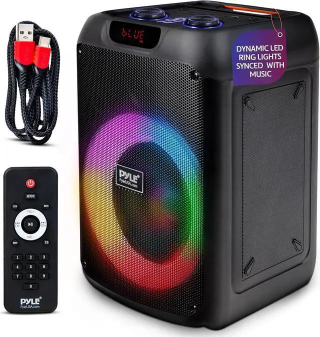 Introducing the Portable BT Party Speaker, the ultimate companion for outdoor gatherings, parties, and on-the-go use. This 100W speaker features a True Wireless Stereo (TWS) system and high-quality sound output with powerful bass and clear treble. Built with outdoor-ready construction and a rugged design, it includes a protective speaker grill for durability. Enjoy seamless music streaming with Bluetooth, USB, Micro SD, and FM radio. The 6.5mm microphone input, along with echo, bass, and treble control functions, make it perfect for karaoke sessions. Dynamic LED ring lights synced with music add a vibrant touch to any event. User-friendly controls for volume, playback, and mode selection, along with an LED display for clear visibility of settings, make this speaker incredibly easy to use. The built-in rechargeable battery with a light indicator provides up to 8 hours of playtime, and the sturdy handle ensures easy transportation. Technical specifications include a construction of PP and iron grill materials, an 8" woofer, a 1" tweeter, and a 4-ohm impedance. It supports MP3 and WAV digital audio files with USB flash support up to 64G. The product dimensions are 9.6" x 9.4" x 14.7", and it weighs 8.6 lbs. The Bluetooth speaker is compatible with today's latest devices, offering a wireless range of up to 50 feet. Whether you need a portable speaker, a karaoke machine, or outdoor speakers, the Pyle Portable BT Party Speaker is your perfect solution, delivering high-quality sound and exceptional versatility.