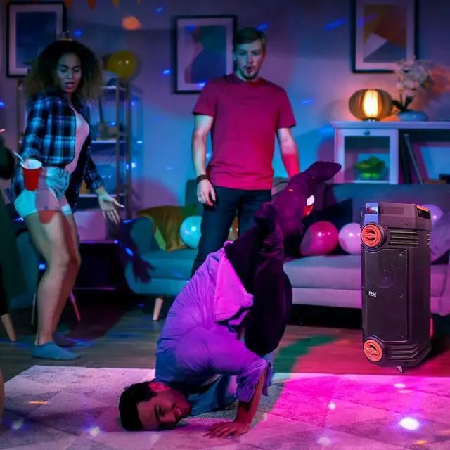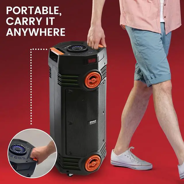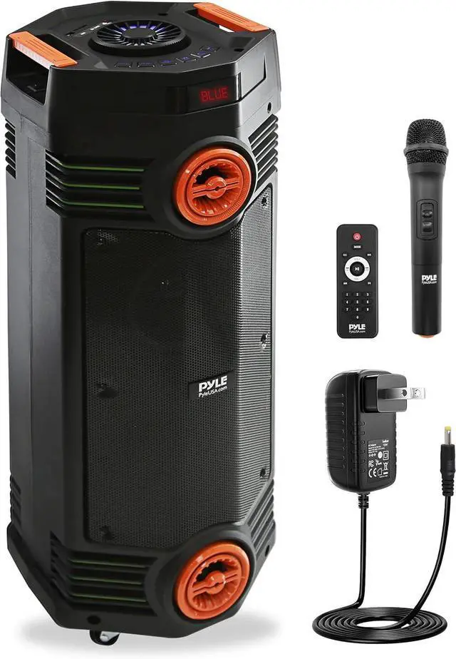 Features: Portable & High-Powered Speaker System, Rugged & Compact Speaker Designed for Portability, Bluetooth Wireless Music Streaming Ability, Multi-Color Flashing LED Party Lights, Flashing LED Lights Bounce & Pulse to the Music Beat, FM Radio with Digital Display, Built-in Rechargeable Battery, Recording Function, Microphone Priority Talk-Over Button, Connect & Stream Audio from External Devices, USB Flash Reader & Micro SD Card Reader, MP3 Digital Audio File Support, Aux (3.5mm) Input, 1/4 -inch Microphone Input, Top Panel Button Control Center, Handle & Rolling Caster Wheels, For Indoor / Outdoor Use, *Optional Power via DC 9V Input, Bluetooth Connectivity: Built-in Bluetooth for Wireless Music Streaming, Simple & Hassle-Free Pairing, Works with All of Todays Latest Devices, (Smartphones, Tablets, Laptops, Computers, etc.), Bluetooth Version: 5.0, Bluetooth Network Name: PYLEUSA, Wireless Range: Up to 32 ft., What's in the Box: PA Speaker System, Remote Control, Power Adapter, Wireless Microphone, Technical Specs: Material: Polypropylene (PP), Power Output: 300 Watt MAX, Sound System: 6.5'' Subwoofer x 2 + 1''Tweeter, Impedance: 3 Ohm, USB Interface Type: 2.0, Digital Media File Compatibility: MP3, Maximum USB Flash Drive Support: Up to 32GB, Rechargeable Battery 7.4V3000mAh 22.2Wh, Battery Powered Remote, requires 1.5V (2) x AAABatteries, (not included), Battery Life: Up to 2 Hours (Charge Time: Approx. 5 Hours), Mic Nominal Current Drain: <100mAh, Battery Operated Mics, Requires (2) x AA Batteries (-Each), Power Supply: 110/240V Switchable (9V/2A Power Adapter), Product Dimensions (L x W x H): 10.43'' x 11.42'' x 28.94'' -inches, Weight: 17.97 lbs.