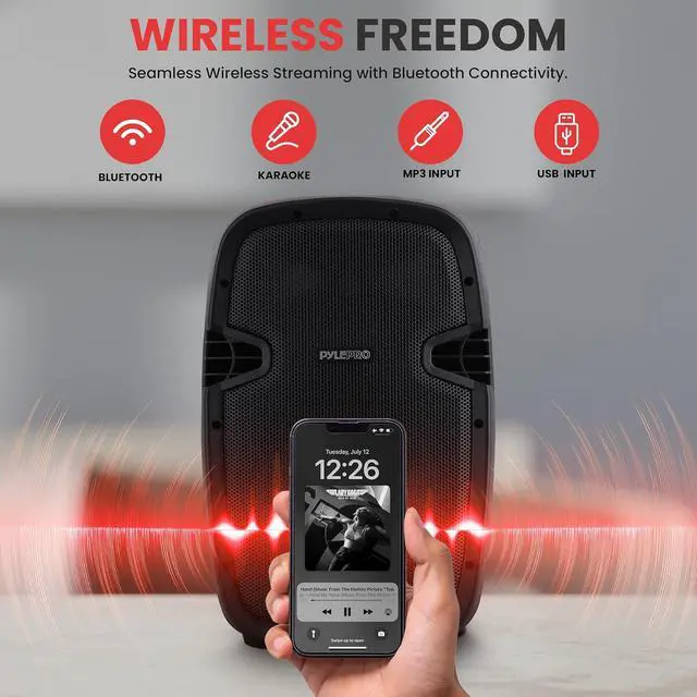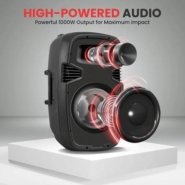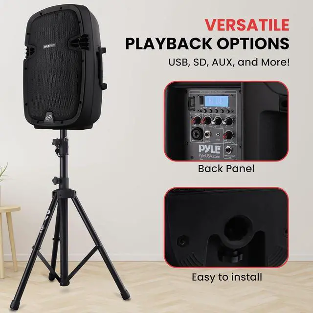 Pyle Model : PPHP1049KT10" Active + Passive PA Speaker KitActive + Passive PA Speaker System Kit - Dual Loudspeaker Sound Package, 10'' Subwoofers, Bluetooth Wireless Streaming, Includes (2) Speaker Stands, Wired Microphone, Remote Control (1000 Watt) System Features:Dual 10-inch High-Powered Loudspeaker PA SystemsIncludes (1) Active Speaker, (1) Passive Speaker + (2) StandsRugged, Durable & Reliable SoundBluetooth Wireless Music Streaming AbilityHigh-Frequency 1.0'' TweetersCompression Driver with Titanium Diaphragm2-Way Full Range Audio ProjectionBuilt-in Digital Audio AmplifierXLR Microphone Input1/4 SpeakOn (8 Ohm) Input1/4 SpeakOn (8 Ohm) Speaker OutputAux (3.5mm) Input JackConnect & Stream Audio from External Devices USB Flash Drive & SD Memory Card ReadersDigital LCD DisplayRear Panel Rotary Dial & Button Control Center Master Volume, Mic Volume, Treble, Bass AdjustableIntegrated Carry Handles35mm Speaker Stand Mount CompatibleHeavy Duty Engineered ABS Housing What's in the Box: (1) 10'' Active PA Speaker (1) 10'' Passive PA Speaker (2) Speaker StandsWired MicrophoneRemote ControlPower Cable Bluetooth Wireless Streaming:Instantly Stream Music from Your Bluetooth DevicesWorks with All Your Favorite Bluetooth Devices (iPhone, Android, Smartphone, iPad, Tablet, PC, etc.)Bluetooth Version: 4.0Bluetooth Wireless Range: 100'+ FeetBluetooth Network Name: 'Pyle Speaker Stands: Effectively Elevates Speakers for Optimum Sound PerformanceUniversal Speaker Compatibility (35mm Insert)Easy Setup and Quick Adjustment ControlReinforced Steel Support ConstructionSpeaker Support Arm ExtensionRugged and ReliableSafety Lock-in PinFoldable for Quick Storage and TransportRubber Capped Tripod Feet BasePerfect for On-Stage or Studio UseFor Professional or Beginner ApplicationsSpeaker Height Adjustable: 59.1'' to 82.7'' MAX. Load Capacity: 100 lbs. (50 kgs.) -Each Technical Specs: MAX Power Output: 1000 WattAmplifier: Class DImpedance: 8 OhmT.H.D.: Magnet: 20 oz.Sensitivity: 92dB (+/-2dB)Mic Input Level: Line Input/Output Level: >250mVFrequency Response: 65-18kHzDigital Audio File Compatibility: MP3, WMAMaximum SD/USB Flash Memory Support: 32GBPower Supply: 120/240VSingle Speaker Weight: 18.08 lbs.The Pyle Active + Passive PA Speaker System Kit - Dual Loudspeaker Sound Package, 10'' Subwoofers, Bluetooth Wireless Streaming, Includes (2) Speaker Stands, Wired Microphone, Remote Control, 1000 Watt - Dual 10-inch High-Powered Loudspeaker PA Systems - Includes (1) Active Speaker, (1) Passive Speaker + (2) Stands - Rugged, Durable & Reliable Sound - Bluetooth Wireless Music Streaming Ability - High-Frequency 1.0'' Tweeters - Compression Driver with Titanium Diaphragm - 2-Way Full Range Audio Projection - Built-in Digital Audio Amplifier - XLR Microphone Input - 1/4 SpeakOn (8 Ohm) Input - 1/4 SpeakOn (8 Ohm) Speaker Output - Aux (3.5mm) Input Jack - Connect & Stream Audio from External Devices - USB Flash Drive & SD Memory Card Readers - Digital LCD Display.