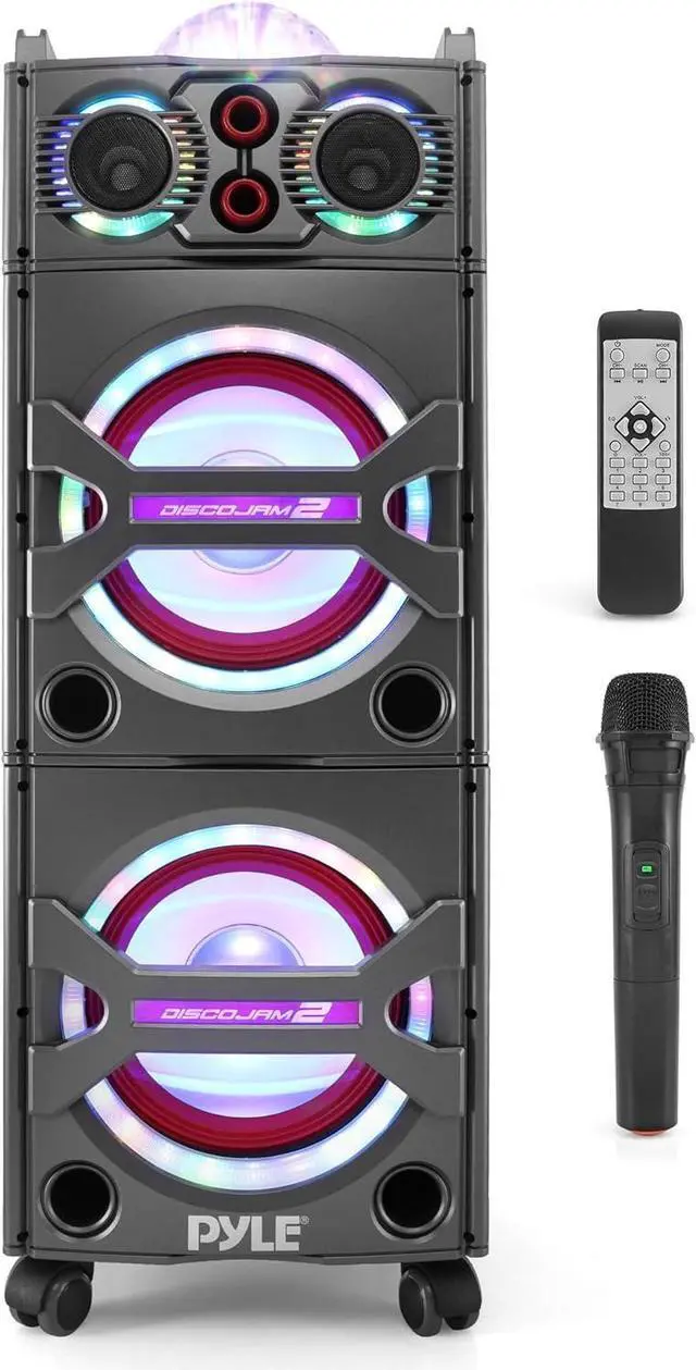 Pump up the party with the Pyle Karaoke Speaker Systems. Enjoy plenty of music streaming options that will add life to any occasion. Included wireless microphone makes it perfect for singalong karaoke parties, Bluetooth audio streaming plays all of your favorite songs wirelessly, and the builtin flashing DJ party lights add visual effects to the highpowered sound Use the system at home, on stage or in the auditorium it's perfect for all of your audio and crowd control needs. Convenient carry handle and rolling wheels allow you to easily transport the speaker system to quickly post up and party Additional features include, USB & SD Memory Card Readers, FM Radio along with the ability to connect additional microphones. Get the party going with the Pyle Disco Jam 2 Speaker Systems. If there is static noise while playing music, it's most likely related to a bad cable/connection on one of the Aux Ports/Cables connected to them. Make sure to firmly connect any cables you are using, and when not using the cable to disconnect them, like when you are using Bluetooth.