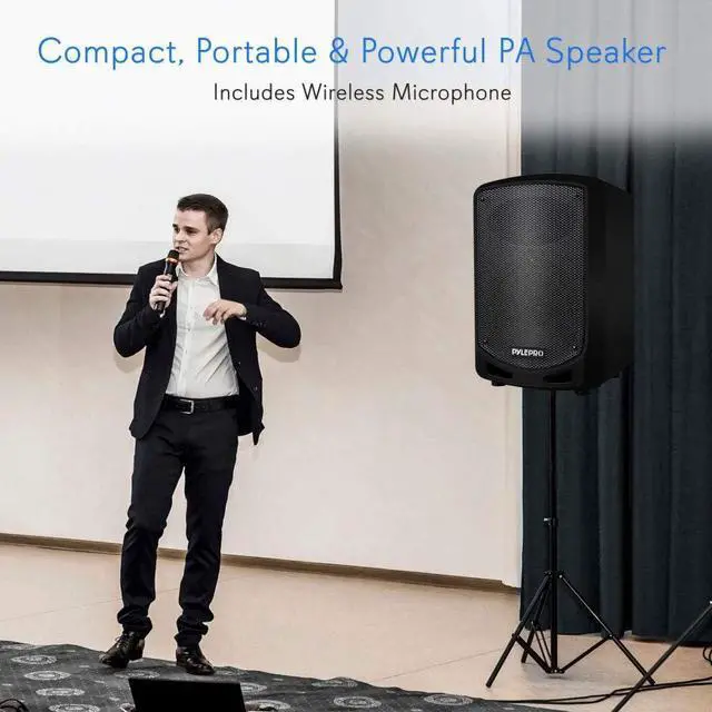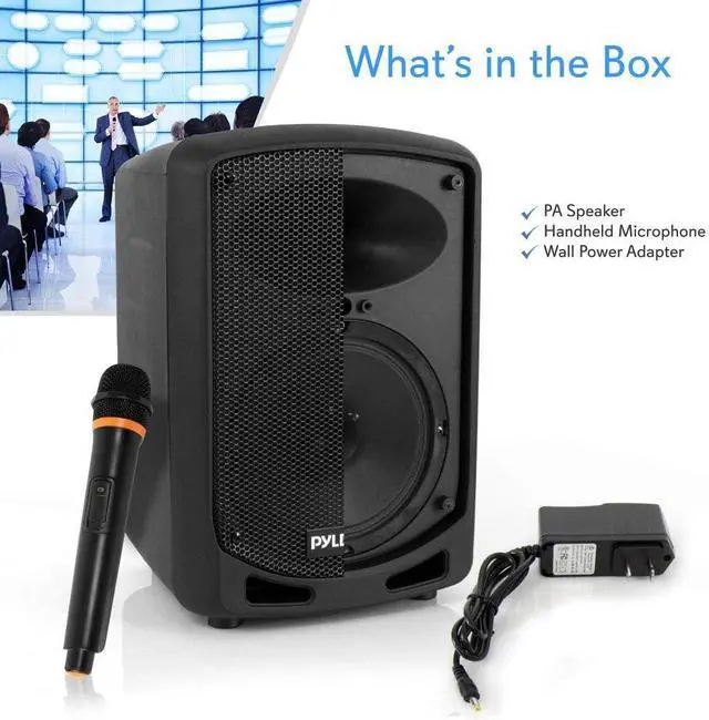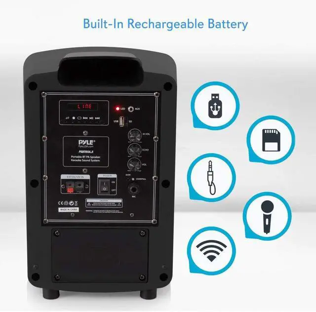 Features: - Compact, Portable & Powerful PA Speaker - High-Powered Audio Karaoke Sound System - Built-in Rechargeable Battery - Bluetooth Wireless Audio Streaming - Digital Audio Recording Mode - Sound System: 6. 5" Subwoofer, 3" Treble Speaker - Rear Panel Button Control Center - Includes Wireless Microphone - 1/4" Microphone Input - Aux (3. 5mm) Input - Connect & Stream Audio from External Devices - USB Flash + Micro SD Memory Card Readers - MP3 Digital Audio File Playback - Audio Configuration: Echo, Bass and Treble Controls - LCD Digital Display Screen - External 12V Power DC Input Connector - 35mm Speaker Stand Mount - Perfect for Karaoke, Public Events, Crowd Control, etc.Bluetooth Wireless Connectivity: - Built-in Bluetooth for Wireless Music Streaming - Works with All of Your Favorite Devices - (iPhone, Android, Smartphone, iPad, Tablet, Computer, etc. ) - Bluetooth Wireless Network Name: PYLE PSBT65A - Bluetooth Version: 3. 0 - Wireless Range: 33+ ft. MP3 Audio Recording Ability: - It's Easy: Mode Button Record Activation - Record Audio as Streamed through the Speaker System - Ability to Record Vocals via Microphone - Records to USB Flash & SD Memory Card - Audio File Type Created: . mp3 - Easy Transfer to PC & Mac Whats in the Box: - PA Speaker - Handheld Microphone - Wall Power Adapter Technical Specs: - Power: 600 Watt - Wireless Frequency Mode: VHF - Sensitivity: 95dB (+/-2dB) - Impedance: 4 Ohm - S/N Ratio: >50dB - T. H. D. : <1% - Rechargeable Battery: 4400mAh, 3. 7V Lithium - Battery Operated Microphone: Requires (2) x AA Batteries - Digital Audio File Compatibility: MP3, WMA, ACC - Maximum USB/Micro SD Support Size: 32 GB - Power: 110/220V (9V Power Adapter) - Speaker Dimensions (L x W x H): 10. 6 x 9. 0 x 13. 0 -inches