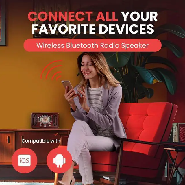 BLUETOOTH-COMPATIBLE: The classic radio features built-in bluetooth wireless music streaming w/ range of over 30 ft. Works w/ todays latest devices including iPhone, Android, iPad, tablets, laptops and computers with hassle-free receiver pairing