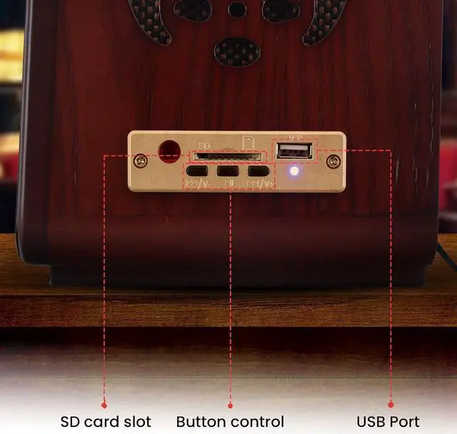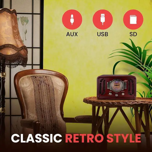 3 INPUTS: The retro inspired speaker lets you connect external devices like MP3 players via the AUX input. Also equipped w/ USB flash drive, SD memory card readers to play stored digital audio files. USB port doubles as charging port for your devices