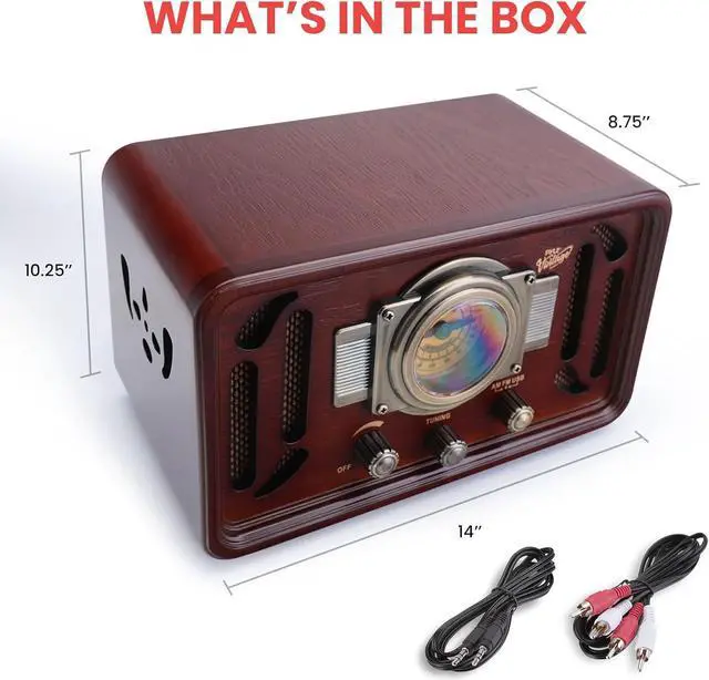 BUTTON CONTROL CENTER: The old fashioned speaker features simple rotary control knobs and front panel button control center for hassle-free audio adjustments. It measures 7.1 L x 11.8 W x 7.1 H in total, perfect for countertop or desktop placement