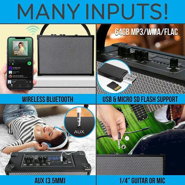 MICROPHONE INPUT: The high-powered bluetooth wireless loudspeaker has ¼ microphone input microphone echo adjustment knob, & bass & treble knobs. Our mini bluetooth speakers lets you enjoy singing by connecting on your microphone with the mic input