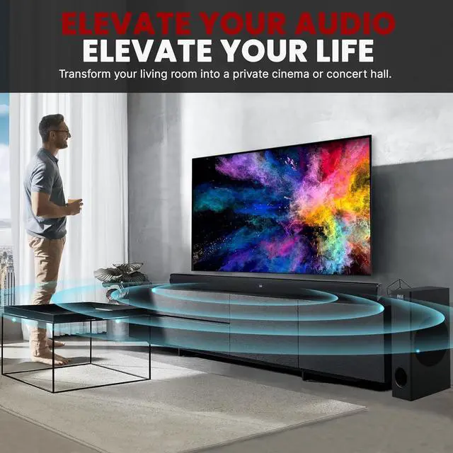 HOME THEATER AUDIO UPGRADE This soundbar for TV delivers rich, full-range stereo audio with its powerful 2.1-channel system. Designed to sit under your TV, it has compact dimensions with impressive sound quality, perfect for indoor entertainment.