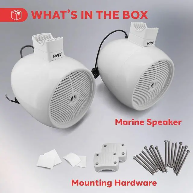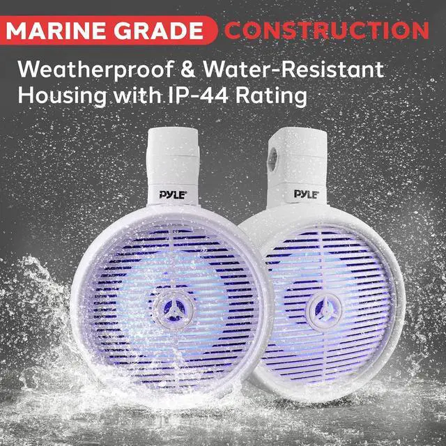 WEATHERPROOF IP-44 CONSTRUCTION: Designed for extreme conditions, the speakers are IP-44 waterproof and housed in a stain-resistant enclosure with a protective grill. Perfect for use in water sports, heavy rain, or rugged outdoor environments.