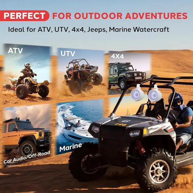 UNIVERSAL MOUNTING OPTIONS: Mount securely on bars or roll cages up to 2.35 in diameter. The versatile design allows easy installation on a wide range of vehicles, ensuring you can enjoy your music anywhere.
