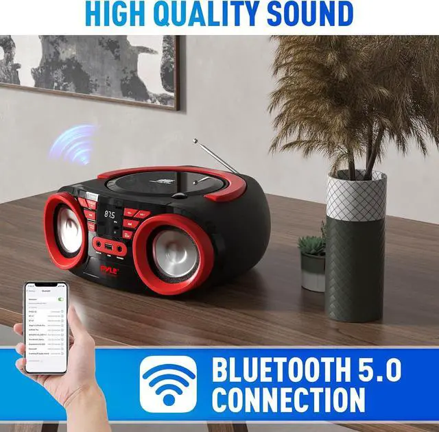WIRELESS BT STREAMING: This Portable CD Player Boombox set is compatible w/ Bluetooth for wireless audio streaming. Works w/ iPhone, Android smartphone, iPad, tablet, laptop, or PC. Ideal for home studio, garage, enclosed patio, or porch deck