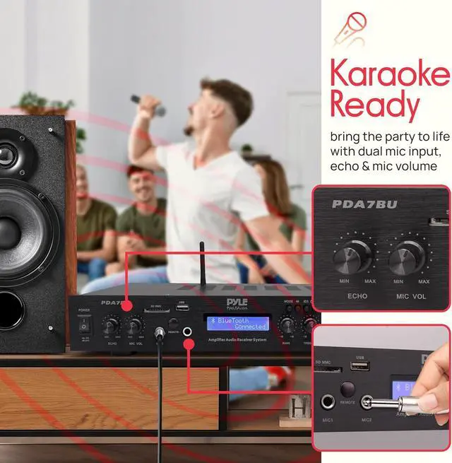 EASY CONNECT: (2) 6.35mm Microphone inputs, Front-Facing 3.5mm Aux in, (3) RCA IN, SD, USB-A