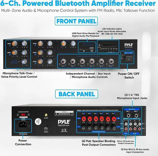 • MULTIPLE INPUTS: The PT6000CH supports various external sources - 3 pairs RCA audio input for tuner, CD player or tape deck. (2) x 1/4" TRS microphone IN, AUX IN, USB, SD card slot. Also features FM, Bluetooth antenna